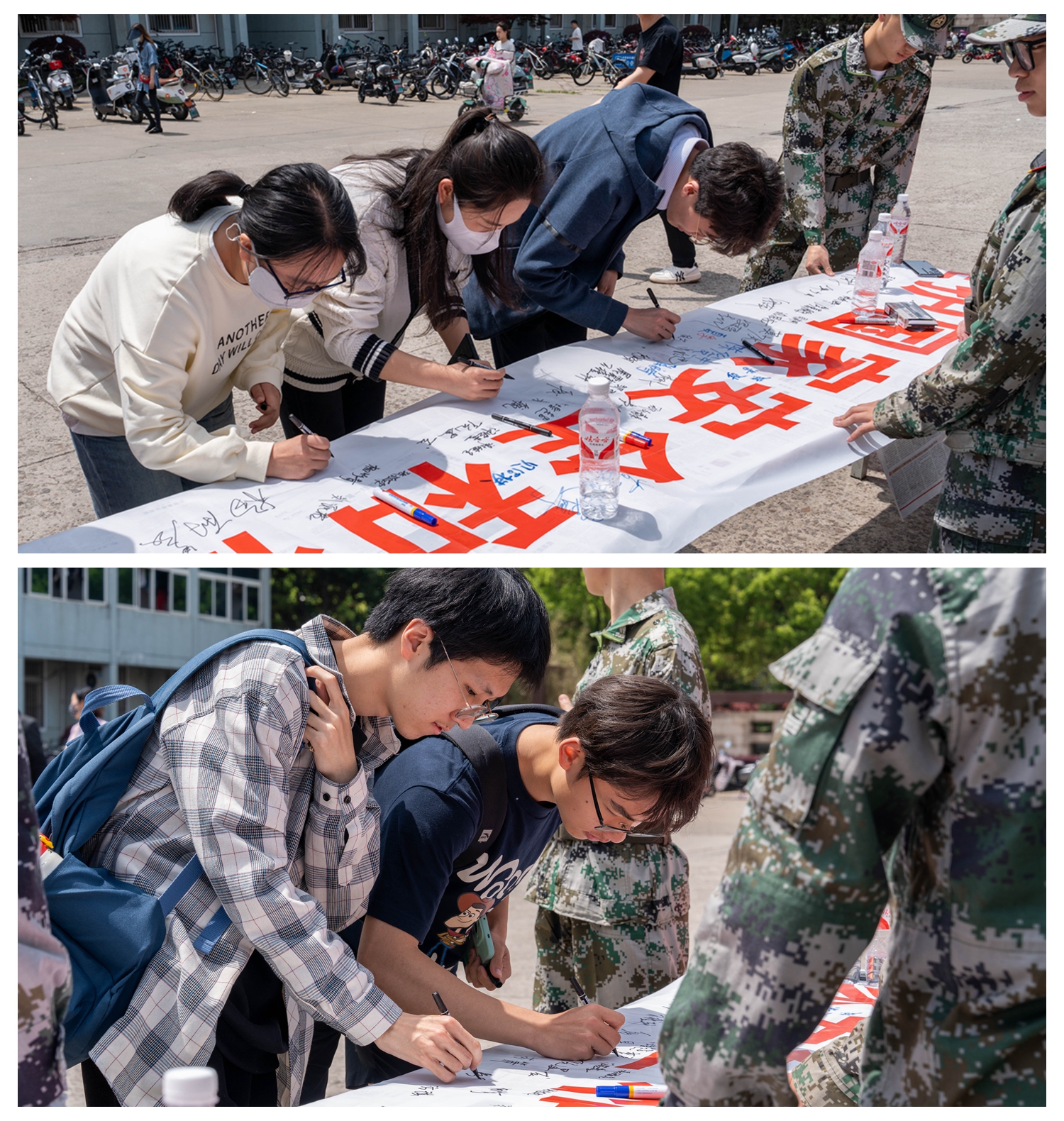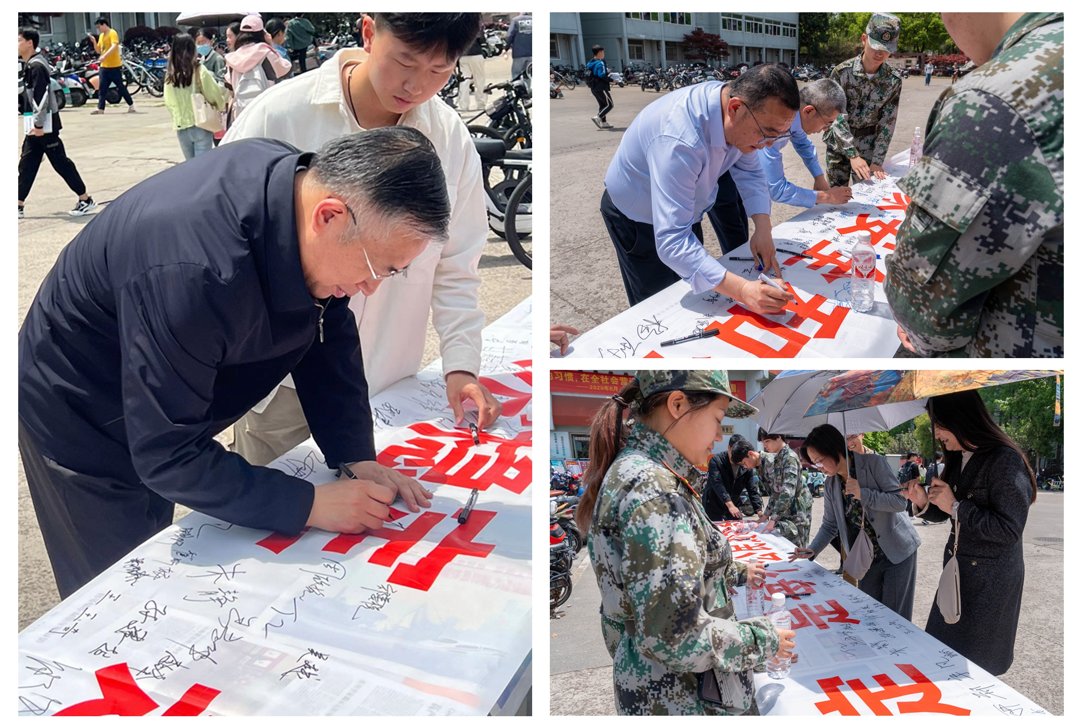 签名现场,校国防协会的学生身着统一的迷彩服,积极主动向过往师生发放宣传材料,让广大师生了解了总体国家安全观的深刻内涵和核心要义,师生们纷纷在“维护国家安全和社会政治稳定,是每个公民的神圣义务”的横幅上签名。