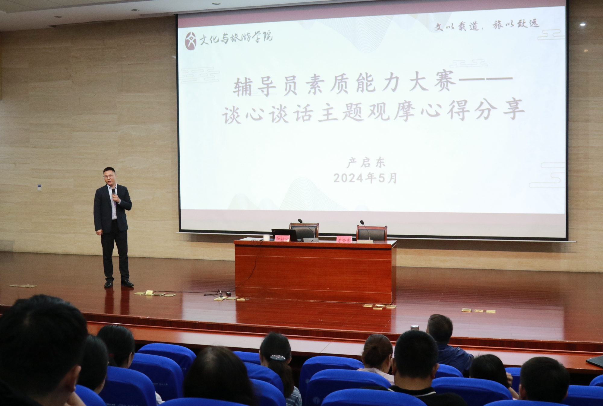 培训第二阶段,文化与旅游学院辅导员产启东分享第十届江苏高校辅导员素质能力大赛决赛观摩感悟并进行谈心谈话现场展示,何桂宏对谈心谈话环节进行点评。