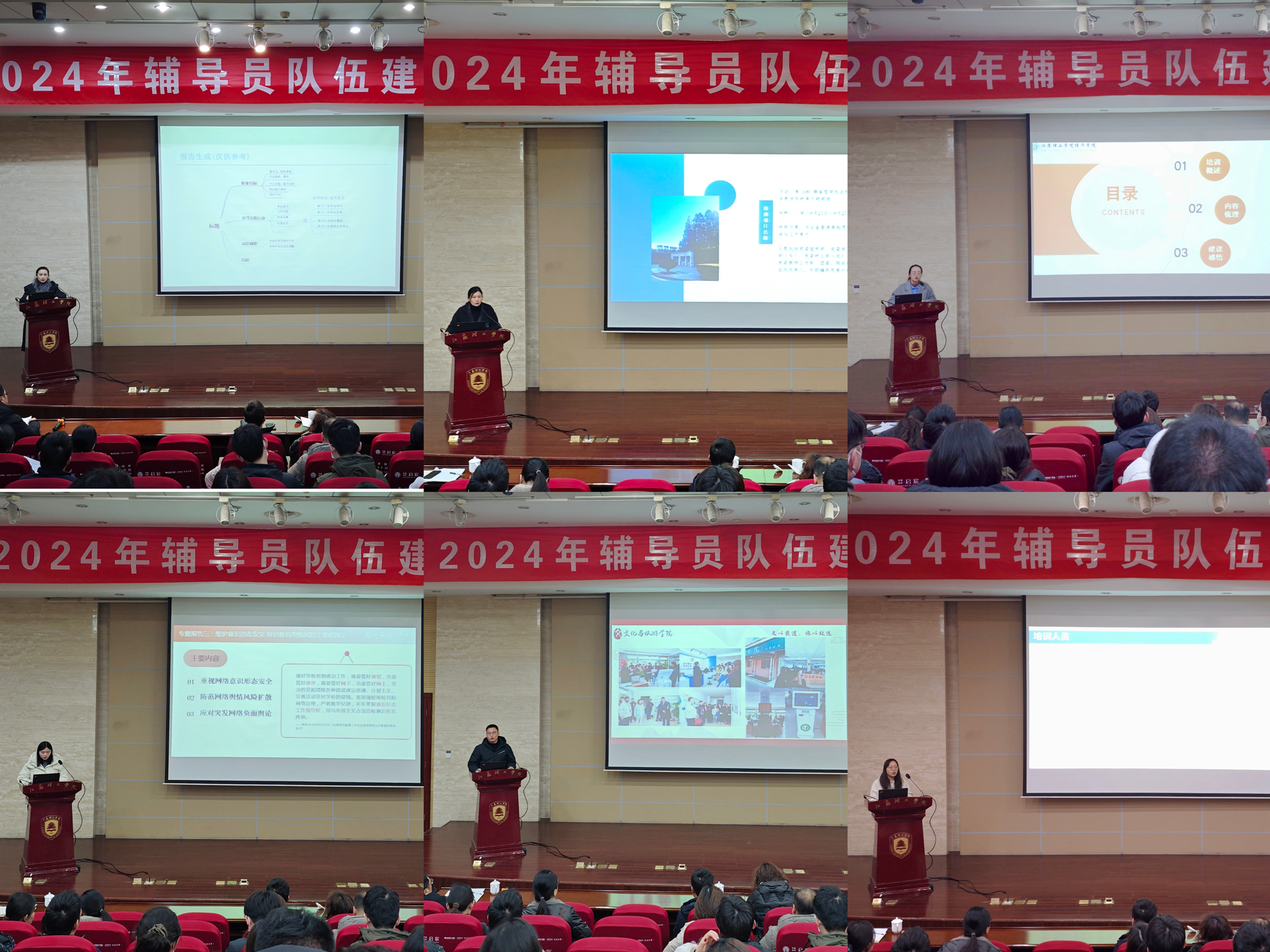 李金东从辅导员选配、培训、素质能力提升、成长、理论研究等方面作辅导员队伍建设工作总结;许晓星、陈晓分别为“笃行”生涯发展工作室、“凌波筑梦”资助育人工作室、“萤火·护航”大学生思想引领工作室、“暖榴理工”少数民族学生教育管理工作室、“职途领航”大学生就业指导工作室、青年工作室等六个辅导员工作室授牌;卢丹、荣文婷、陆育蕾、李秀秀、产启东、刘娴等六名辅导员交流校外培训心得体会。