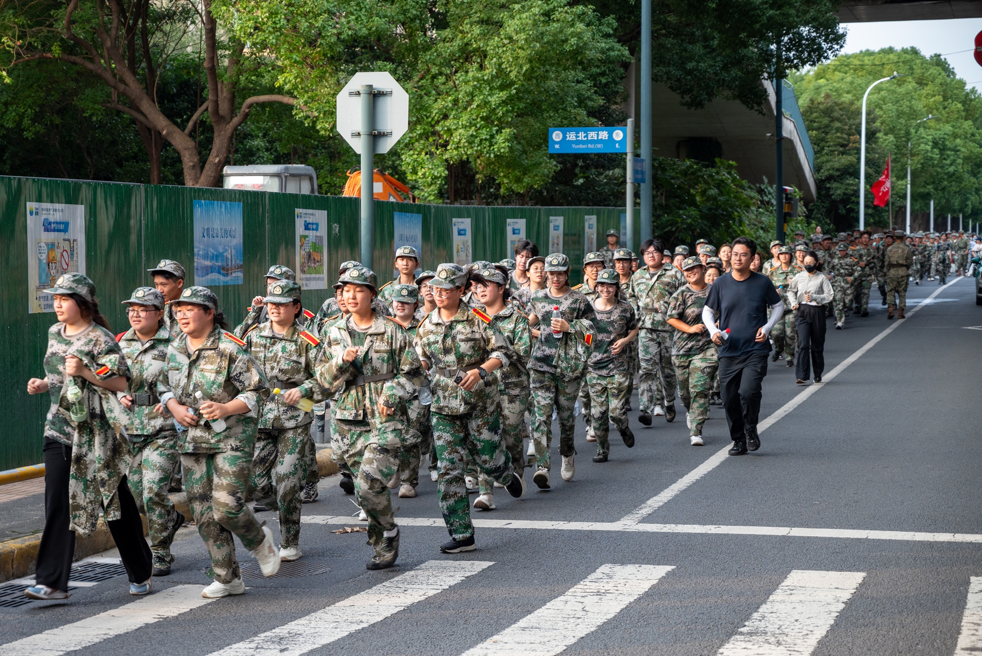 拉练途中,同学们步伐铿锵有力,每一步都踏得坚实而稳重,仿佛在丈量着成长的道路。各营的旗帜在微风中猎猎作响,鲜艳夺目,成为拉练队伍中一道道亮丽的风景线。歌声、口号声此起彼伏,充分展现了前期军训的扎实成效与理工学子奋发向上、勇于拼搏的青春风采。