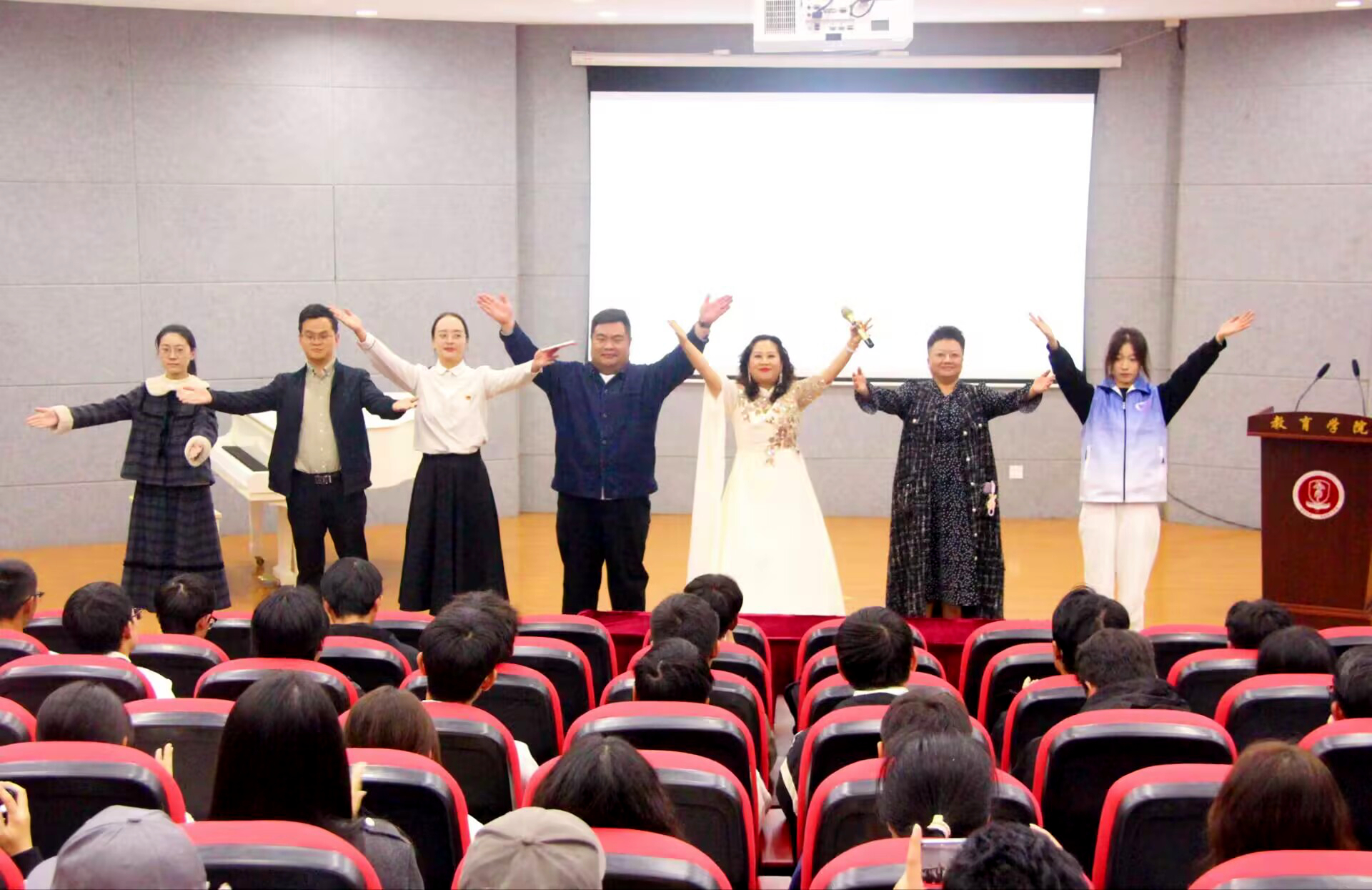 本次活动的核心环节,是由我院李爱丽副教授主讲的民族团结教育“开学第一课”暨声乐表演公开课《弘扬民族美 放歌新时代》。三部由李爱丽原创编曲、张芸芸两位老师音乐制作的音诗画作品,以经典红色歌曲与多民族代表性民歌为脉络,引导学生在音乐情绪中感受中华民族的奋斗历程,在诵读中体悟各民族文化的交融共生,以及对未来教学实践过程的青春愿景。来自侗族的2025级新生龙力榕在课后激动地表示:“李老师通过现场示范、互动教学、情感解析等方式,让我们体会到音乐是超越语言的情感共鸣,是连接你我他的文化血脉。感觉非常奇妙,让我们一见如故,就像相亲相爱的家人。”蕴含的历史厚度与文化温度的民族团结教育“开学第一课”,伴随着师生共情的《灯火里的中国》回味无穷。