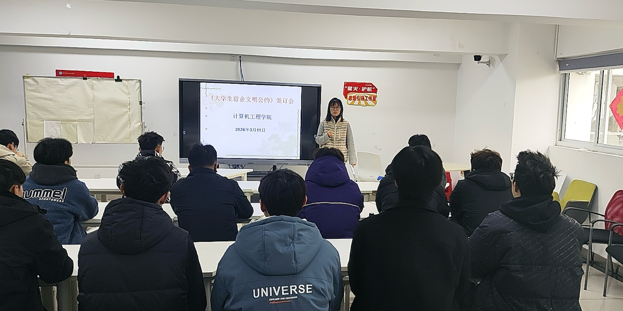 为深入推进校园文明建设,强化学生宿舍育人功能,引导学生树立文明住宿理念,培养自律意识与集体责任感,营造整洁、安全、和谐、向上的宿舍环境,3月11日下午,计算机工程学院在“一站式”学生社区召开《大学生宿舍文明公约》签订会。各班级治保委员代表参加本次会议。